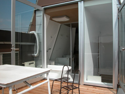![]() デッキテラスよりバスルームを見る。星を見ながらバスタイムが施主の夢でした。 |