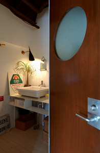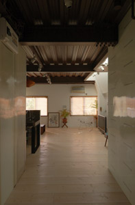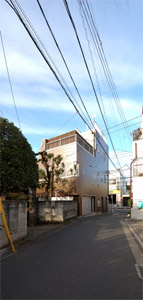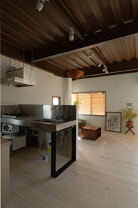 | ホームステッド リノベーション homestead renovation 2005 東京都三鷹に位置する築18年鉄骨造3階建て住居ビルの全面改装. 水廻りのフロア変更、雨漏り、既存増築プレハブと鉄骨階段の撤去と大規模な工事です.南側は近隣商業地域と住居地域の境目に位置するため,隣家の緑の借景と武蔵野の面影が残る一帯の眺望がすばらしい敷地です.ロンドンとパリでの生活経験があり,古いモノと新しいモノのバランス感覚が鋭く、そのあたりがリノベーションにあたっての大きなテーマとなりました。2階はLDKとホールがひとつづきの空間となるよう光を透過しツヤのあるFRP平板のパーティションで統一、そこに既存の扉をアレンジして再利用しています。3階は、フロア全体が完全なプライベートユース。寝室〜ユーティリティ〜浴室〜デッキテラスが回遊できるようにつながって、裸で過ごせる場所になっています。外観と2,3階の天井にチョコレート色やセピア色などお揃いで有機的な色を配し,道路からの見えがかりに奥行きと面白味をもたせています。床の明度が低く天井が明るい空間に慣れた目に、動きや独自の雰囲気を醸し出す効果を期待しています。 photo by Jin Hosoya |